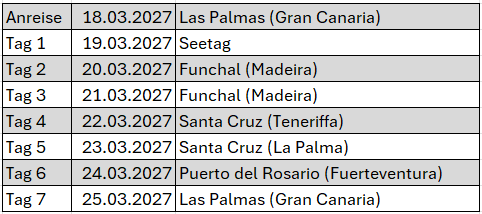 Im März 2027 lädt die Mein Schiff 7 zu einer unvergesslichen Reise zu den Kanarischen Inseln und nach Madeira ein. Auf dieser abwechslungsreichen Kreuzfahrt erwarten Sie atemberaubende Landschaften, faszinierende Kultur und das milde Klima des Atlantiks – die perfekte Kombination für eine Frühjahrsauszeit.